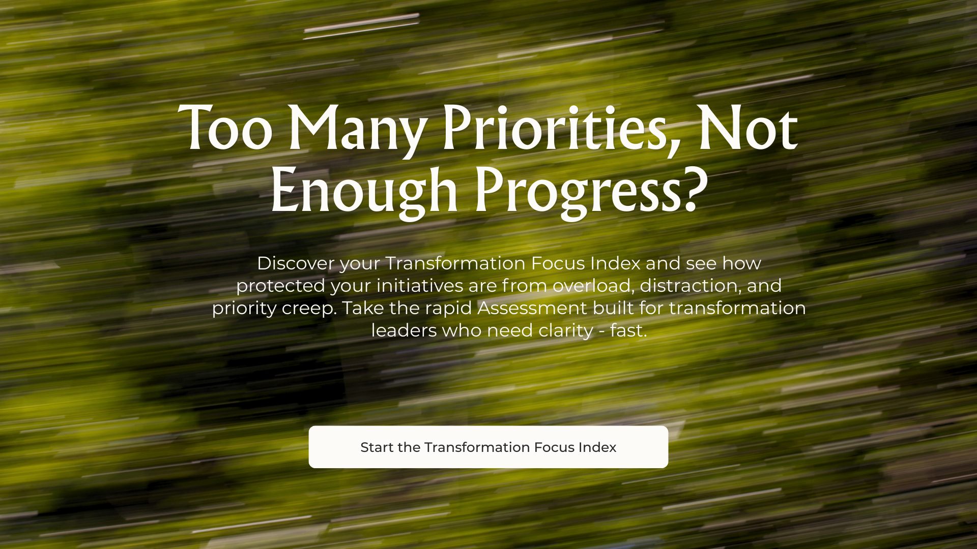 Discover your Transformation Focus Index and see how protected your initiatives are from overload, distraction, and priority creep. Take the rapid Assessment built for transformation leaders who need clarity - fast.